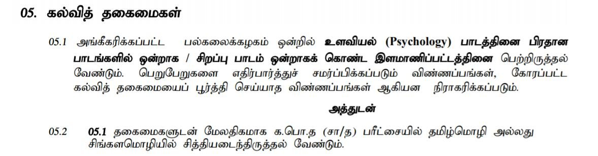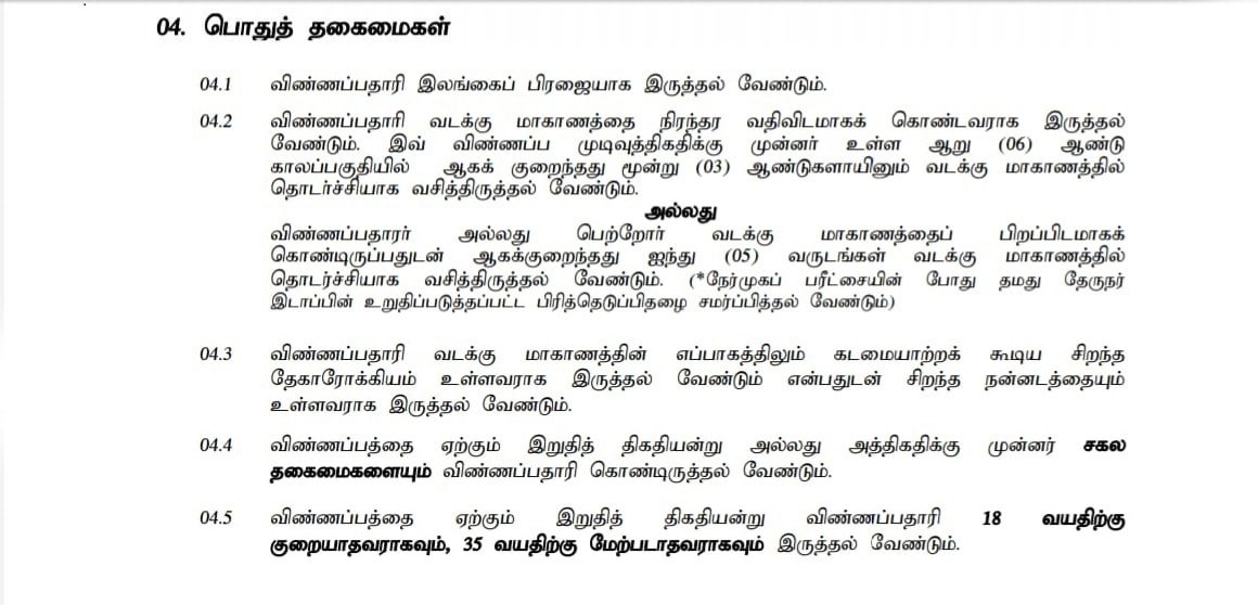 வடக்கு மாகாண பாடசாலைகளில் நிலவும் இலங்கை. ஆசிரியர் சேவையின் 3 ம் வகுப்பு 1 ( அ ) தரத்திற்கு வழிகாட்டலும் ஆலோசனையும் ஆசிரியர் பதவிக்குரிய வெற்றிடங்களுக்கு பட்டதாரிகளை ஆட்சேர்த்துக் கொள்வதற்காக. தகைமையுடைய விண்ணப்பதாரிகளிடமிருந்து விண்ணப்பங்கள் கோரப்படுகின்றன.