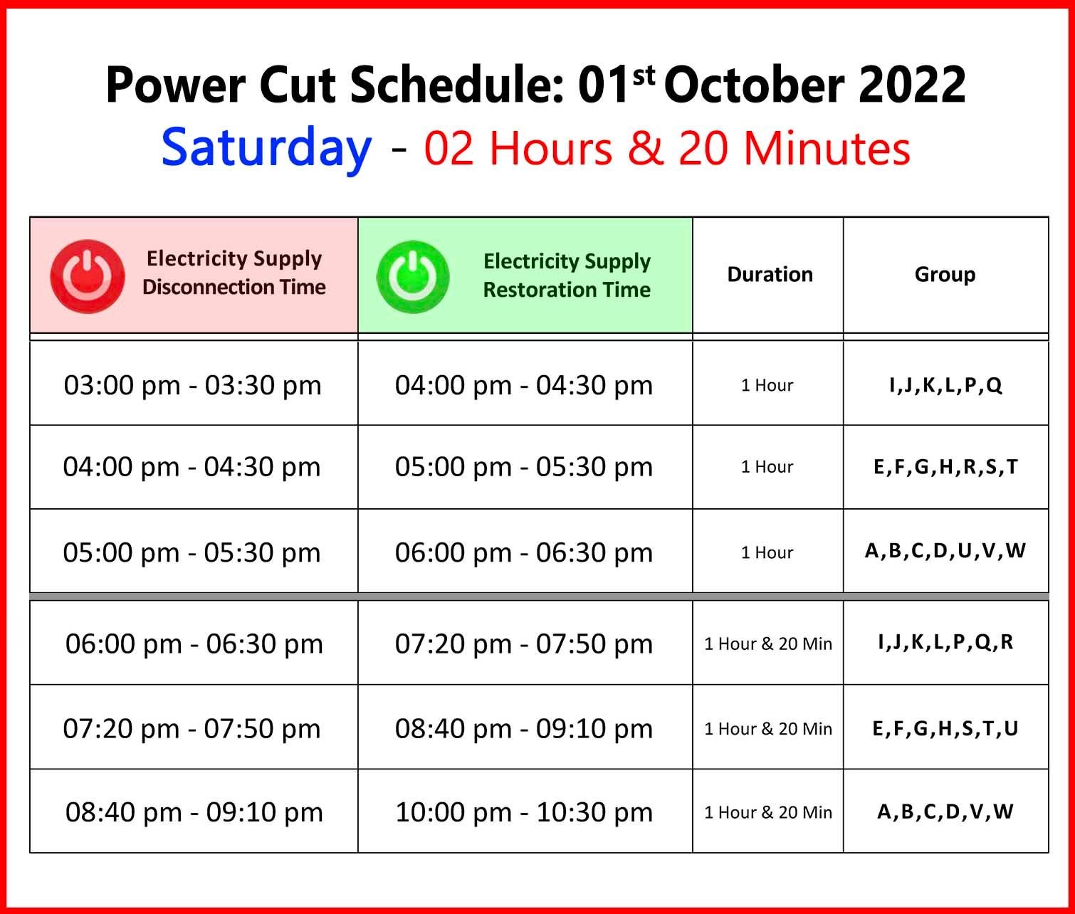 Power Cut Schedule – மின்வெட்டு அட்டவணை 01.10.2022