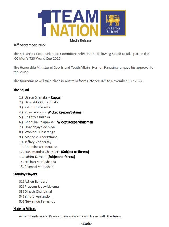 டி20 உலகக் கோப்பைக்கான இலங்கை அணி அறிவிக்கப்பட்டது