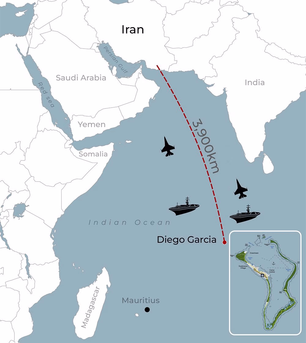ஈரான் தனது நாட்டுத் தரப்பிலிருந்து இரண்டு நடுத்தர தூர பாலிஸ்டிக் ஏவுகணைகளை டியாகோ கார்சியாவை நோக்கிக் குறிவைத்து ஏவியுள்ளது. இதில் ஒரு ஏவுகணை தொழில்நுட்பக் கோளாறால் தோல்வியடைந்த நிலையில், மற்றொன்று அமெரிக்காவின் ஏவுகணைப் பாதுகாப்பு அமைப்பால் (SM-3 வகை) தடுக்கப்பட்டிருக்கலாம் எனக் கருதப்படுகிறது.